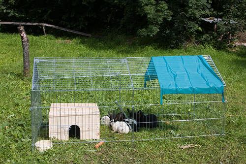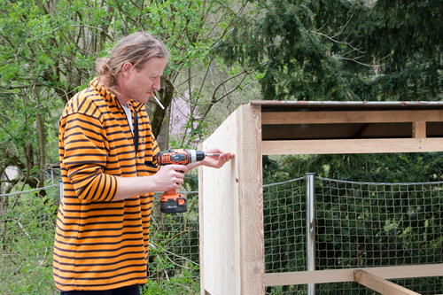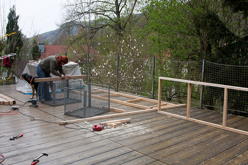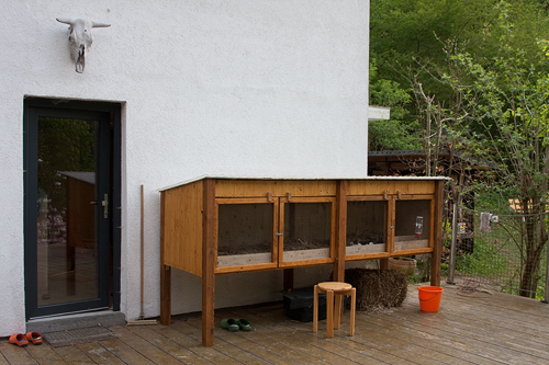 6 Balken als Träger und 2 Rahmen bilden die Hauptteile der Konstruktion. Alles wurde mit Winklen verschraubt und geklebt. Die Böden sind aus Plastik und herausnehmbar. Zum Ausmisten kann man mit der Schubkarre unter den Stall fahren. Die Wände bestehen aus Nut-/Federbrettern, damit kein Wind durch den Stall zieht. Der Stall ist nur außen lackiert mit Wetterschutzlack. Innen wurde auf eine Lackierung verzichtet, damit die Kaninchen das Holz gefahrlos anfressen können.