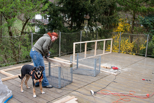 Zwei Wochen lebten die Häslein in einer kleinen Kiste, dann zogen sie in eine etwas größere Mörtelkiste um. Doch bald mussten wir wir mit dem Bau eines Stalls beginnen Dieser sollte ausreichend Platz bieten, damit alle zusammen bleiben können. Wir machten ein paar Zeichnungen, besorgten Holz und begannen mit dem Bau.